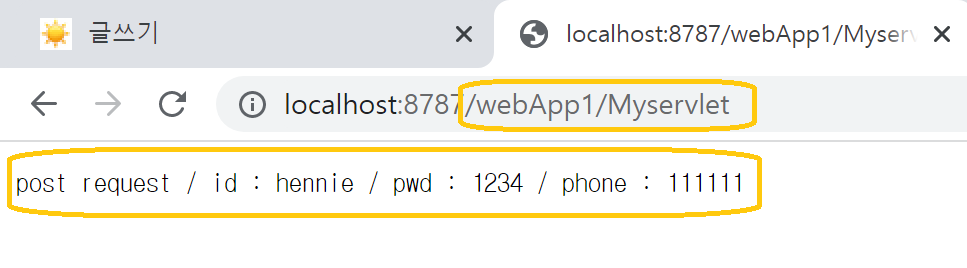 html의 <form action="/webApp1/Myservlet" method="post"> 의 action의 웹 주소가 되고 있다는 것을 확인 할 수 있다.