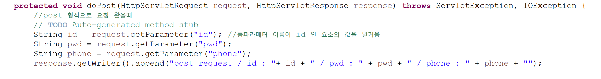 response.getWriter().append("post request / id : "+ id + " / pwd : " + pwd + " / phone : " + phone + "");