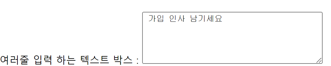 여러줄 입력 하는 텍스트 박스 : <textarea rows = "5" cols= "40"> 여러줄 입력 하는 텍스트 박스 </textarea><br/>