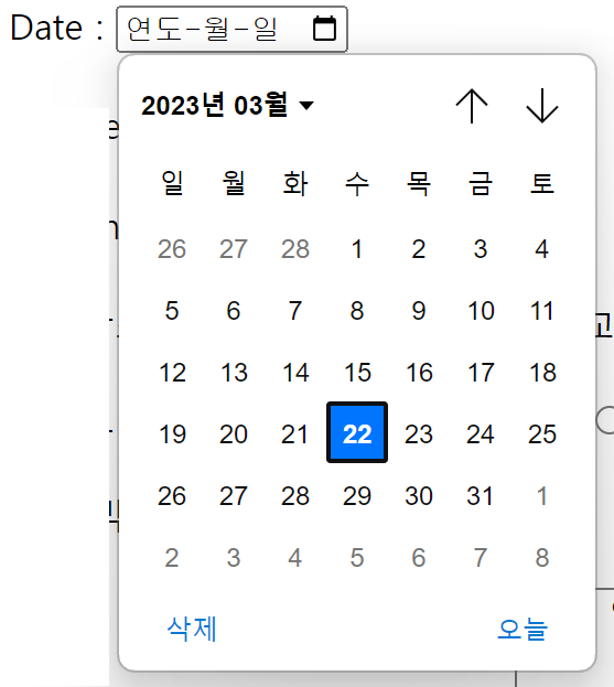 날짜를 선택 하는 캘린터가 나오는 박스로 type 을 date 라고 지정 한다.