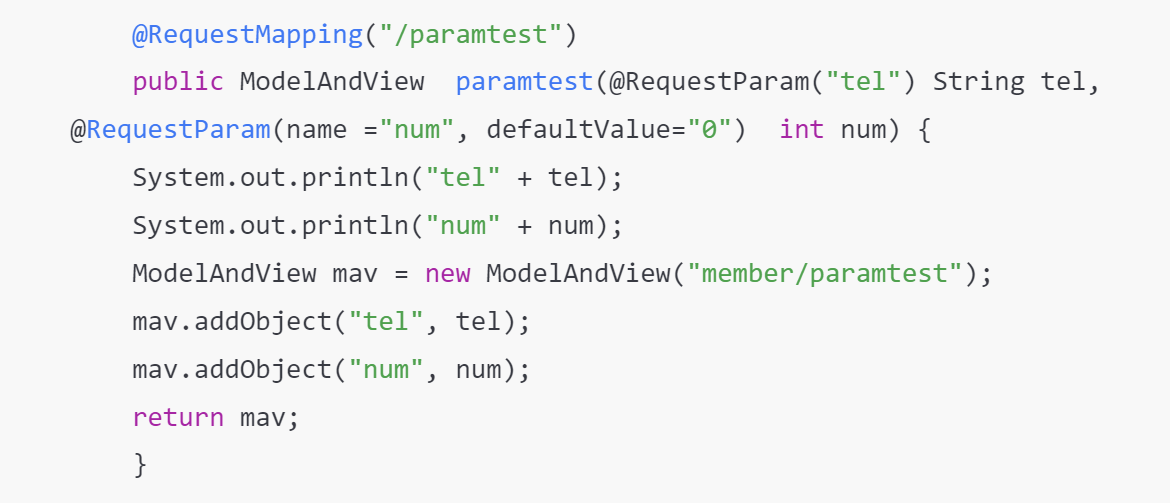 public ModelAndView paramtest(@RequestParam("tel") String tel, @RequestParam(name ="num", defaultValue="0")int num) {