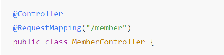 class 시작 전, @RequestMapping("/member") 라고 명시해 두면 앞으로 이 컨트롤러에 올 모든 url 앞에 ("주소") 가 자동으로 붙는다