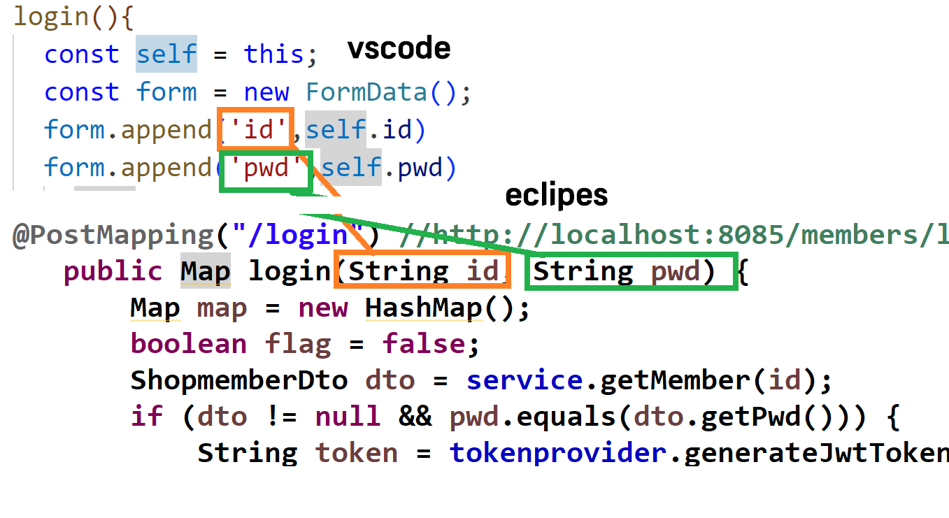 vscode 에서 eclipes 로 spring 데이터를 폼데이터에 담아서 보낼 때 보내는 값이 파라미터로 받는 값과 같아야 한다.