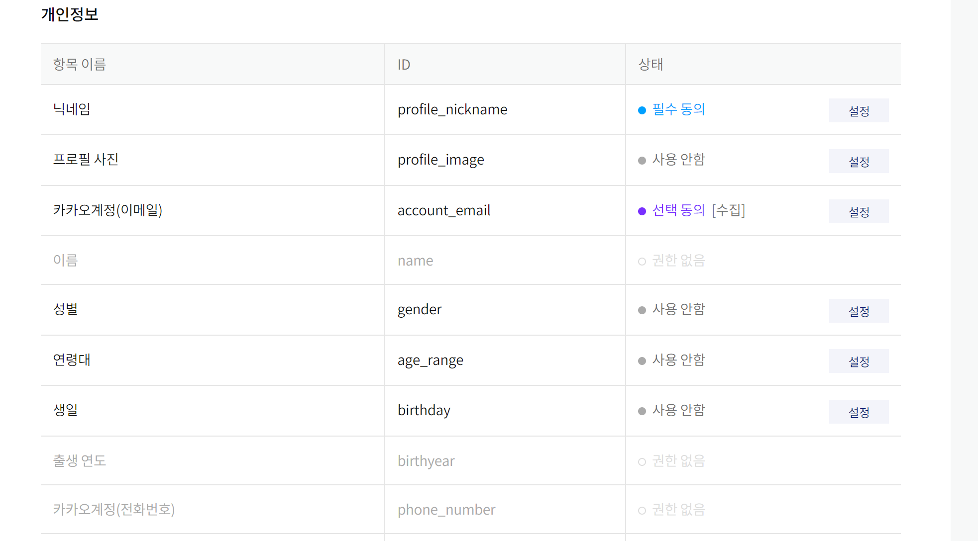 카카오톡 로그인 서비스를 ON으로 돌리면 흔히 보는 동의 설정이 가능한 목록들이 나온다. 여기서 필요한 정보만 상태를 설정해서 가져오면 된다. 근데 우선 나는 TEST 버전이라 설정할 수 있는 내용이 딱히 많지 않았다. 그중 필요한 정보만 동의받는 걸로 설정을 해주었다.