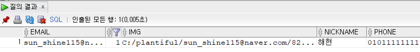 이렇게 되면 오라클 데이터 베이스에 아래와 같이 저장된 것을 확인할 수 있다. 나는 카카오톡 로그인과 일반 로그인을 구분하기 위해서 1과 0으로 구분을 지어주었다. 왜냐하면 추가 기능으로 카카오톡 로그인을 했으면 하지 못하는 기능과 나나누어져 있기 때문!
