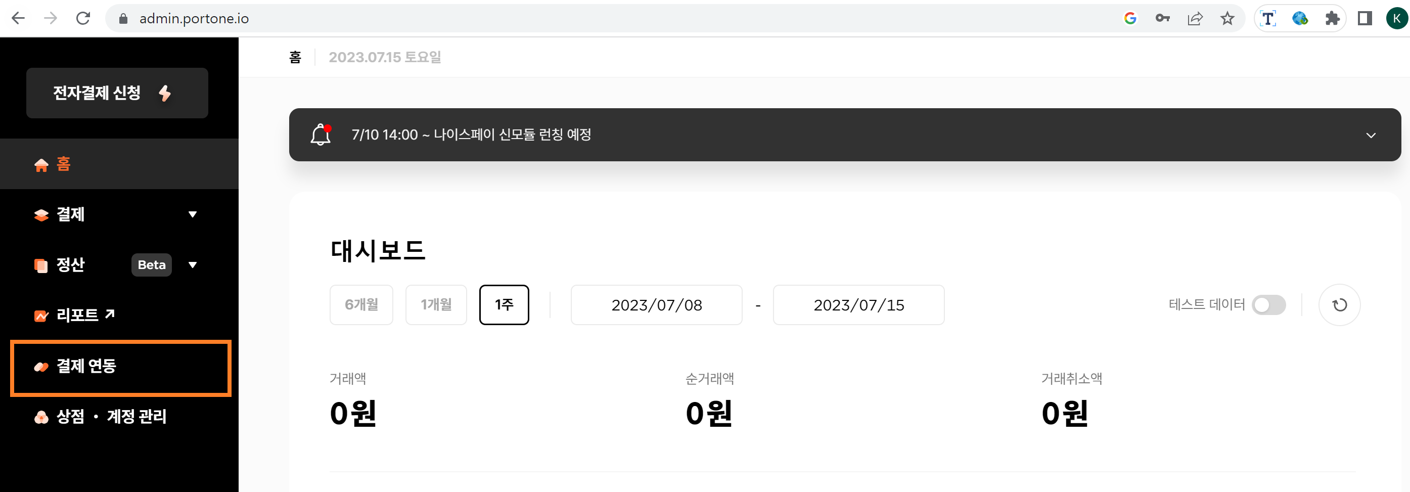 회원 가입 후 꽤나 그럴싸 해보이는 페이지를 만나게 된다. 그대로 왼쪽 사이드 바에 있는 결제 연동을 클릭한다.