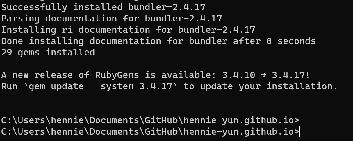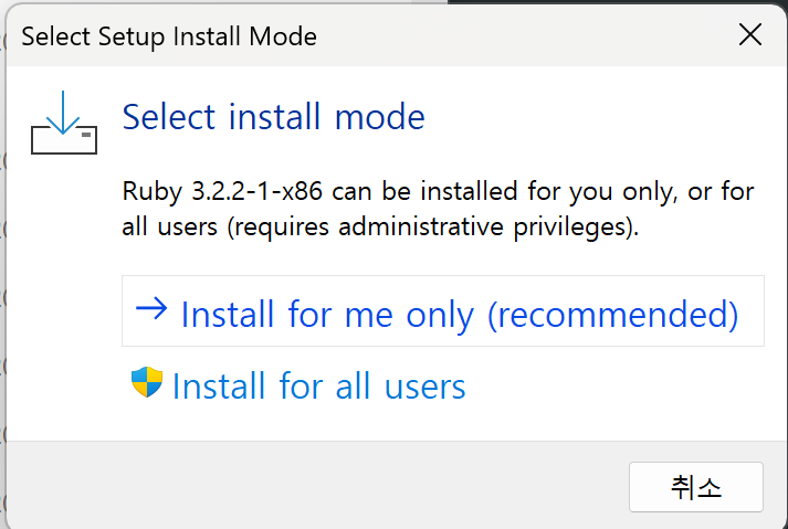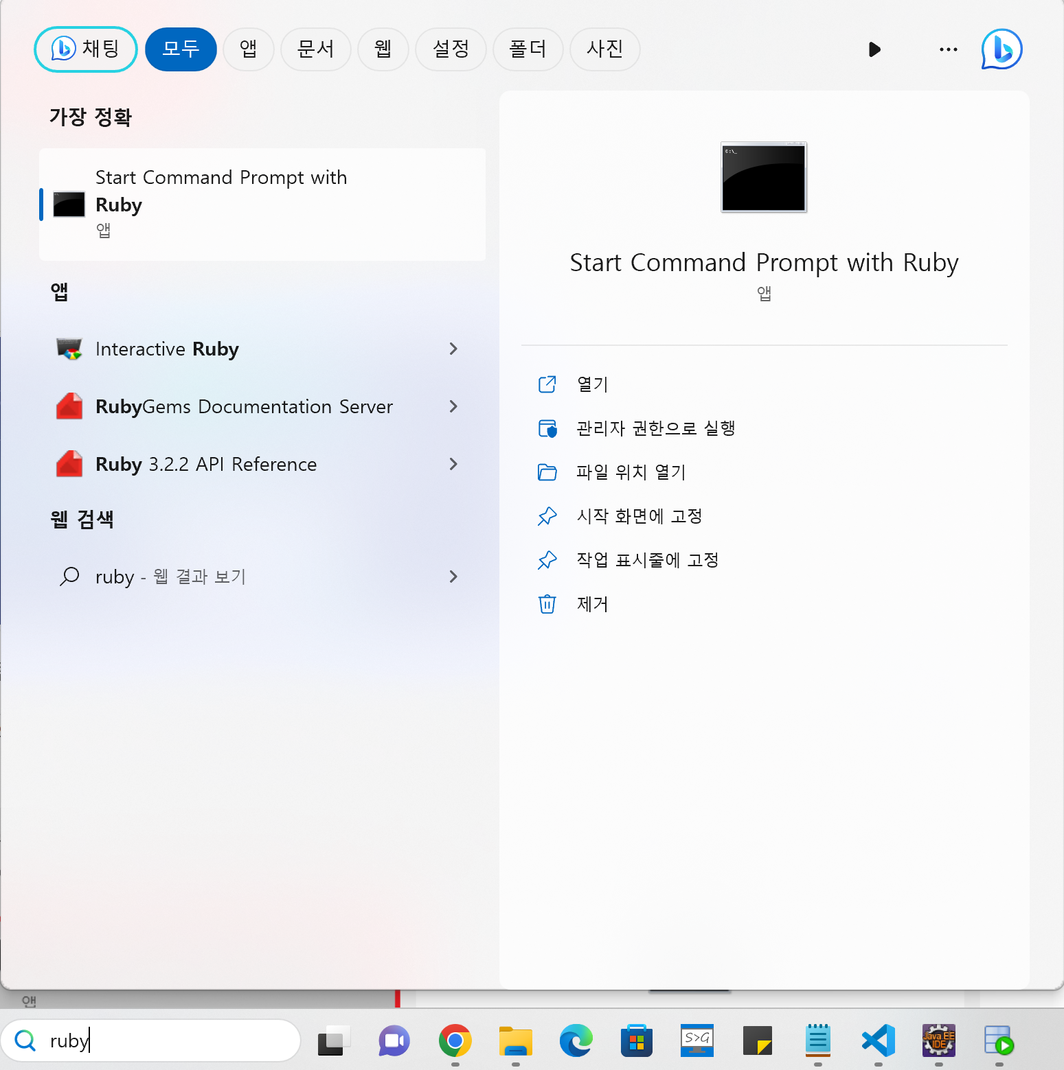 설치가 완료 되었다면 검색창에 ruby라고 검색 후 Strat Command Prompt with Ruby를 실행해 준다. 그러면 이렇게 cmd 창이 나오게 된다. 여기서 이제 1편에서 clone 할 때 지정 해 준 폴더로 들어가면 된다.