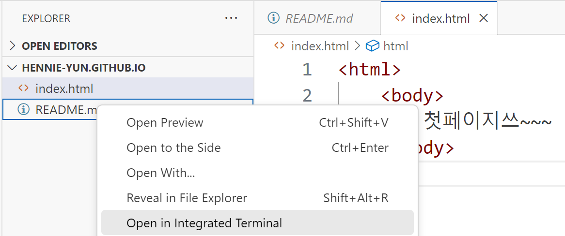 VSCode에 README.md 파일에서 우클릭후 Terminal에서 열기를 누르면 해당 파일의 주소가 VSCode Terminal에 나오게 된다. 해당 주소를 복사 후 "cd 파일경로"를 입력해 주면 된다.