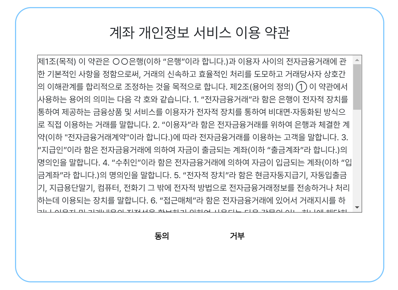 제1조(목적) 이 약관은 〇〇은행(이하 “은행”이라 합니다.)과 이용자 사이의 ~~~~~~ 너무 길어서 생략!!