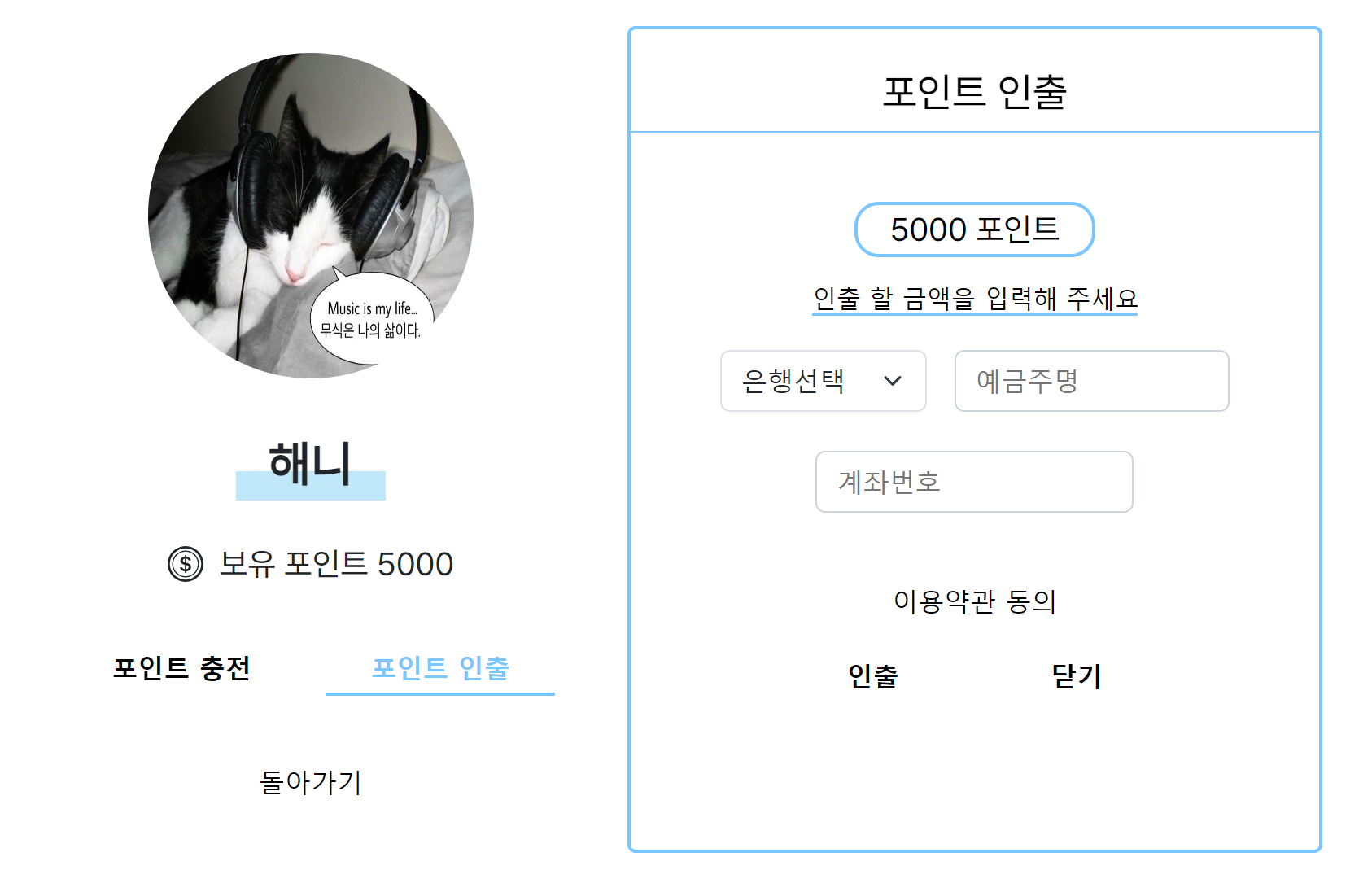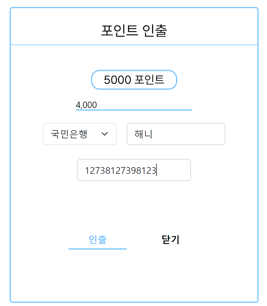 포인트 인출 클릭 -> 인출 관련 내용을 적는 모달창 -> 이용약관 동의 -> 인출