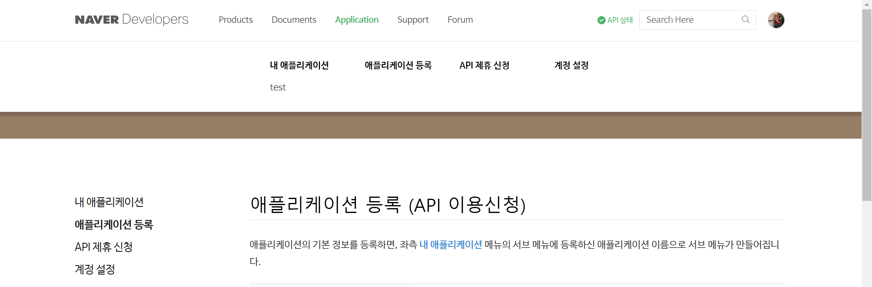 애플리케이션 -> 내 애플리케이션에 들어가면 자신이 등록한 이름을 클릭해 준다.