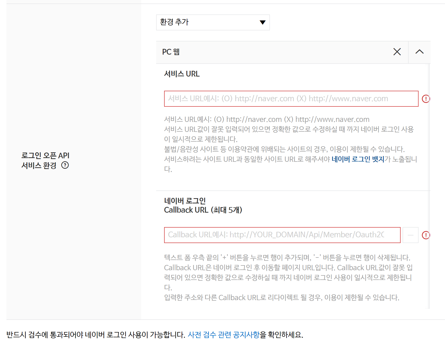 등록을 하면서 로그인 오픈API 서비스 환경에 PC 웹을 추가하면 아래와 같이 어딘가 묘하게 익숙한 것들을 볼 수 있다. 바로 카카오톡에서 한 것 처럼 서비스 url 주소와 redirect url 이다. 이제는 당황하지 않고 입력 해준다.