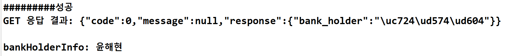HttpURLConnection으로 원하는 주소로 요청을 보내고 응답 받은 JSON객체를 파싱 하여 값을 받는 순서로 진행된다. Access Token을 발급받았다면 해당 토큰을 setRequestProperty를 이용하여 속성을 설정하고 예금주 성명을 요청하면 또다시 JSON으로 응답이 올 것이다. 그걸 또 파싱 해서 Map에 값을 담아 Return 하면 우리가 원하는 예금주 성명 조회를 성공적으로 마칠 수 있다~