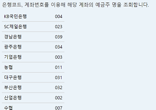 은행 코드는 아래의 사이트에 가면 나와있다. 나는 대중적인 은행 몇개를 골라서 작성했다~