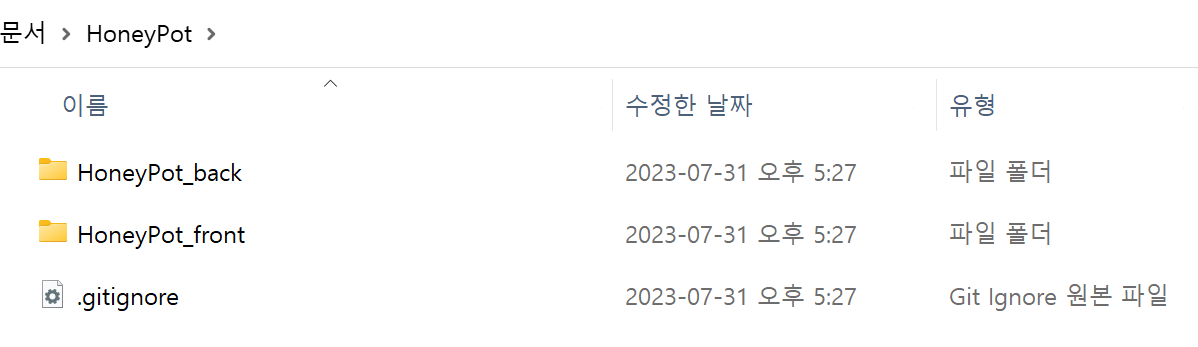 여기까지 하면 .git 을 제외한 폴더 두 개와 gitignore 파일이 생성된다.
