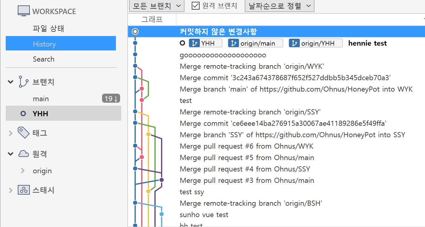 그러면 이렇게 소스트리 히스토리에 기록이 남는다.