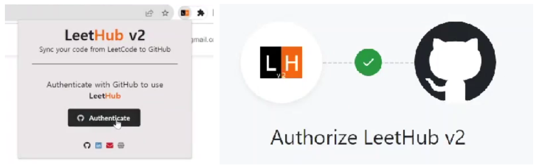 설치 후 플러그인 버튼을 눌러 leethub를 상단에 고정시켜 주고 클릭한다. 그러면 왼쪽 사진과 같이 보이게 될 텐데 여기서 Authenticate를 눌러 본인의 github와 연동시켜 준다.