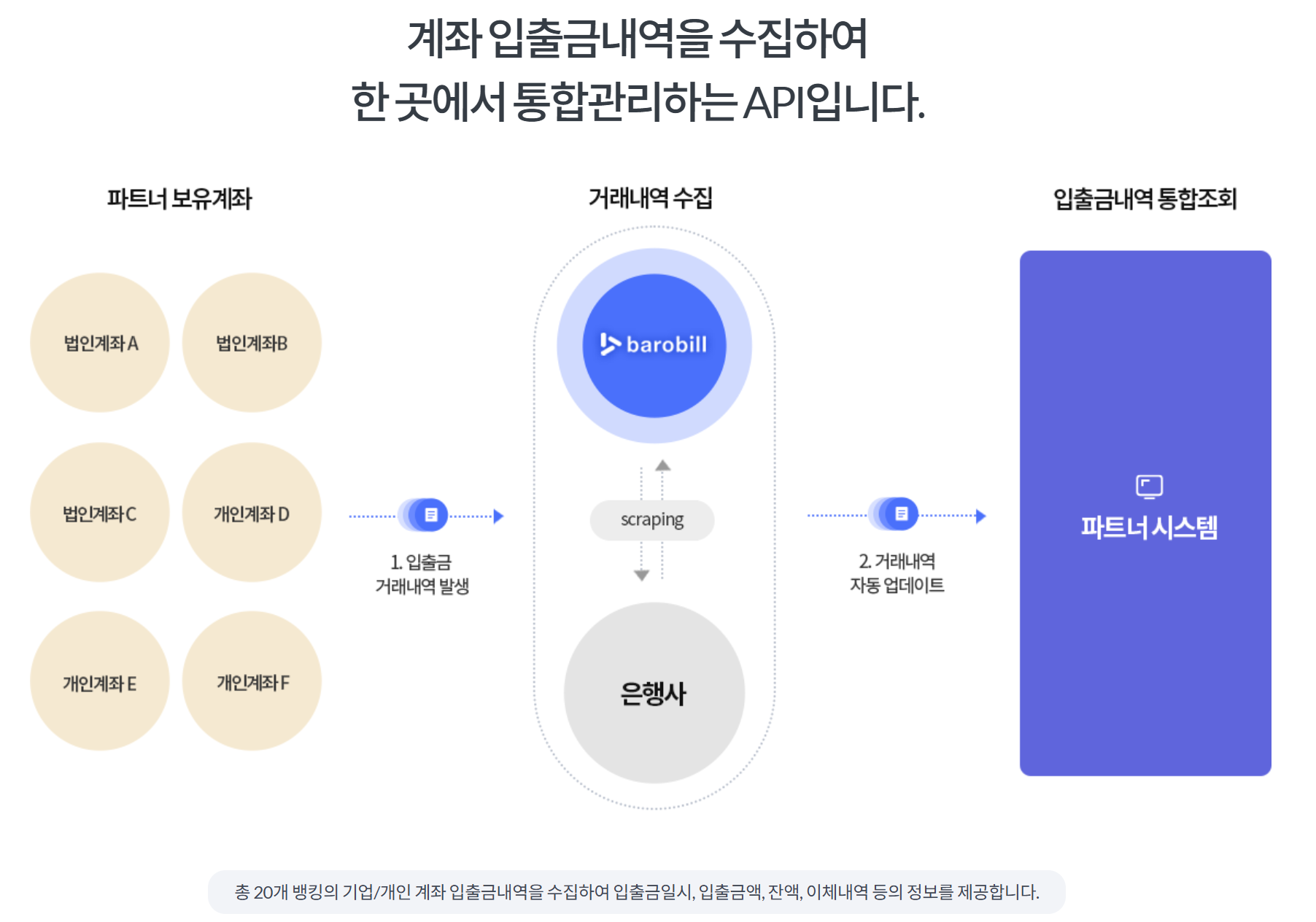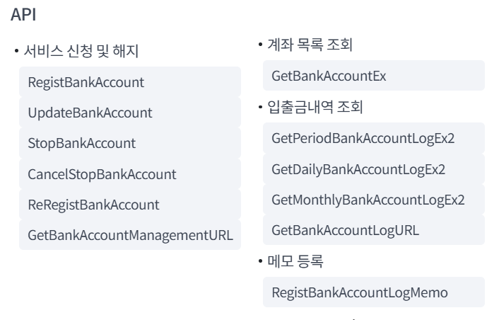 최근 회사에서 계좌확인 API와 카드사용내역 API를 연동해서 지출 내역을 한 번에 확인할 수 있는 기능을 추가하는 프로젝트를 하게 되었다. 원래는 은행별로 로그인하면서 확인해야 했었기 때문에 경영팀에서 조금 귀찮고 번거로웠다면서 올해가 가기 전에 개편을 하자고 했다. 그래서 관련 API를 제공하는 업체를 찾아보니 두 곳이 나왔는데 견적서도 받아보고 개발자센터에 설명도 잘 되어있나 확인도 해보고 난 후 가장 합리적인 바로빌을 선택하게 되었다.