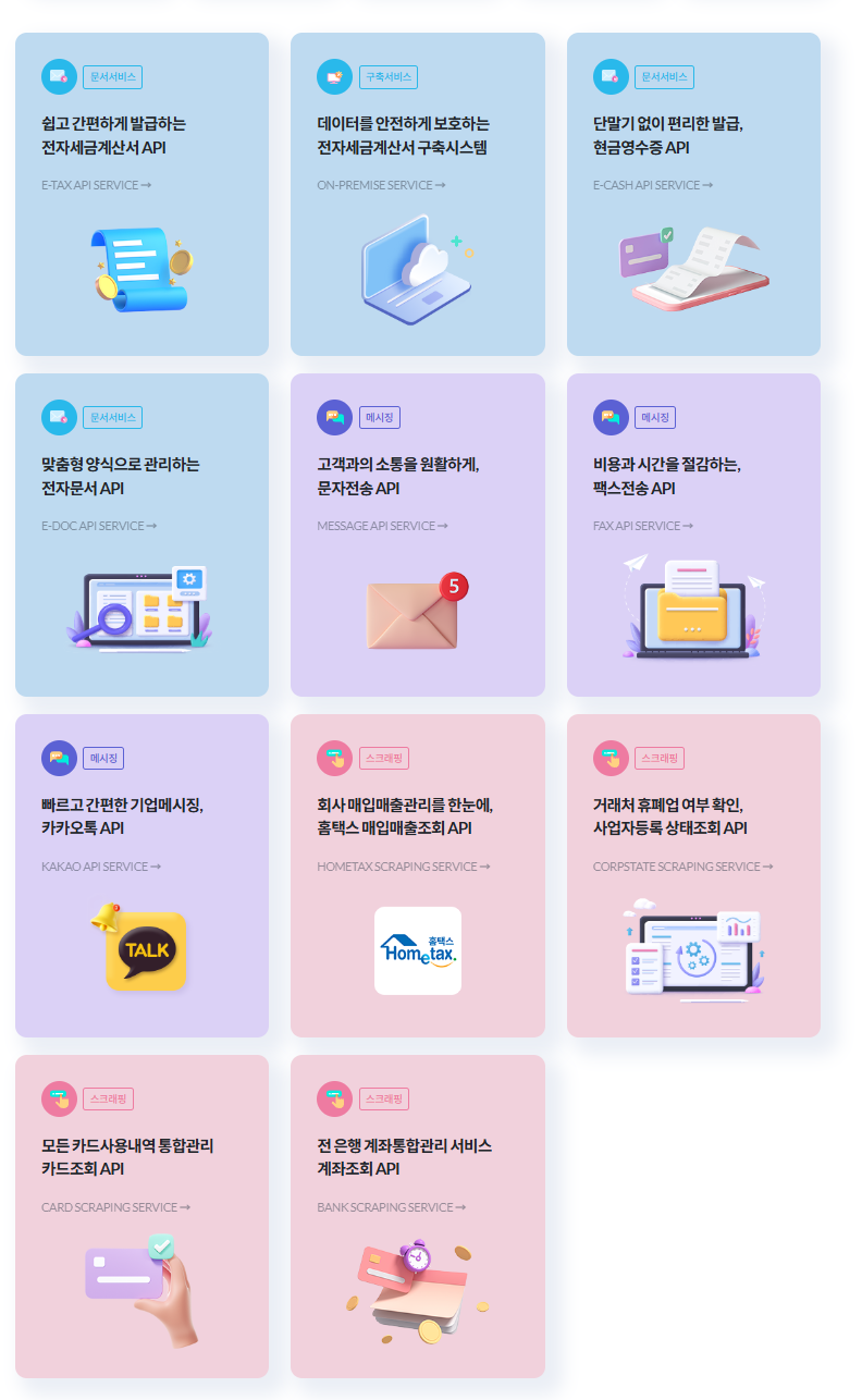 솔루션/사이트/ERP에 세금계산서, 메시징, 스크래핑 등 API 연동서비스를 연결하여 기업에 필요한 비즈니스 데이터를 제공하는 API 전문기업