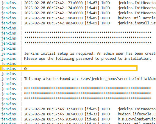 13. Jenkins의 최초 비밀키를 알기 위해 docker compose log 를 입력한다. 중반쯤에 본인의 비밀키를알 수 있을 것이다.