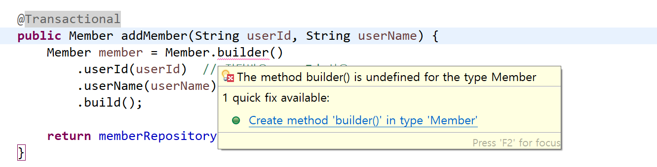 The method builder() is undefined for the type entity 라는 오류가 생겼다.