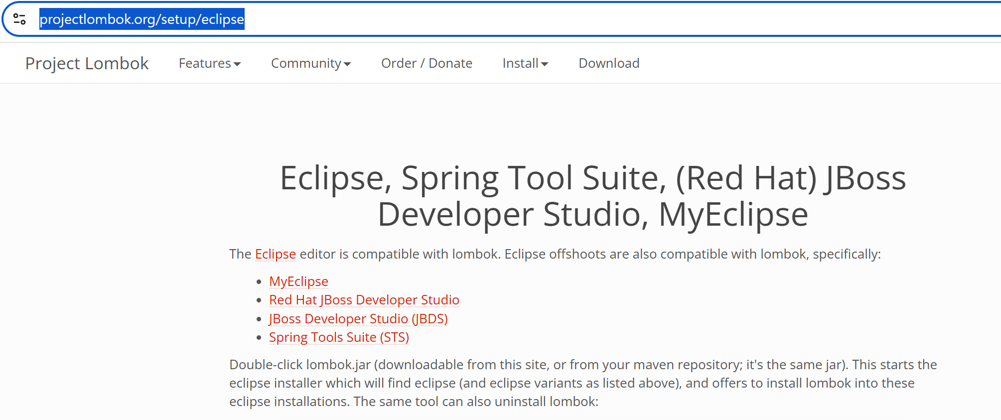 아래의 홈페이지에 들어가서 상단탭의 Download를 받아 주면 lombok.jar 파일이 다운로드되어질 것이다.