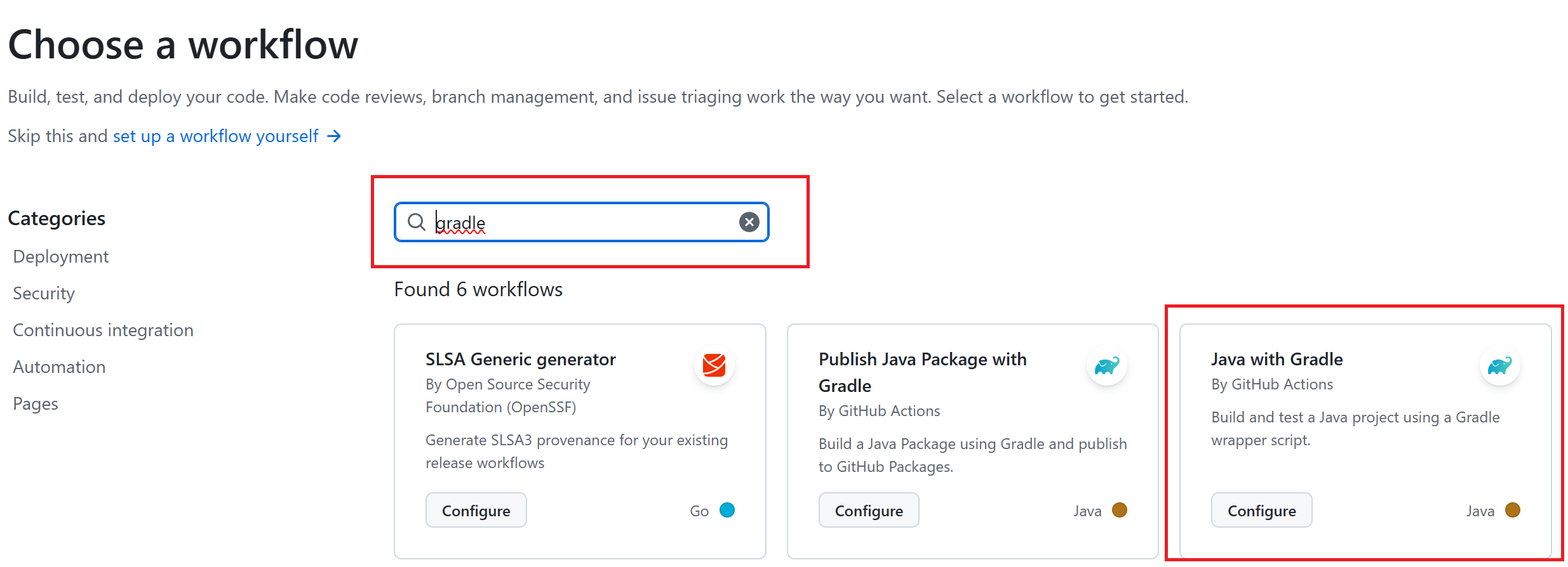 gradle 을 검색하면 Java with Gradle 이라는 workflow를 클릭한다.