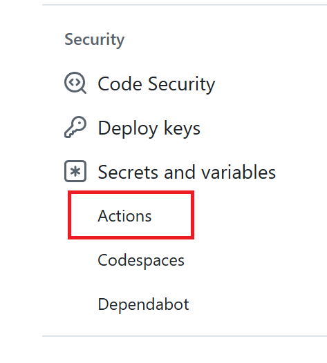 yml 파일에서 사용 했던 {secrets.키 이름} 을 따로 등록 해주어야 한다. 상단탭 setting을 클릭하면 왼쪽 사이드 바에 security 가 있다.