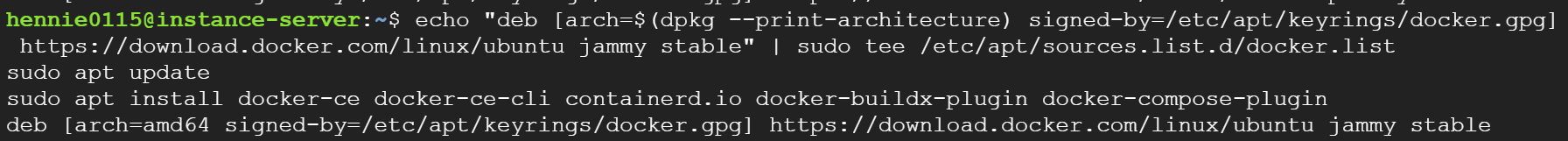 echo "deb [arch=$(dpkg --print-architecture) signed-by=/etc/apt/keyrings/docker.gpg] https://download.docker.com/linux/ubuntu jammy stable" | sudo tee /etc/apt/sources.list.d/docker.list
