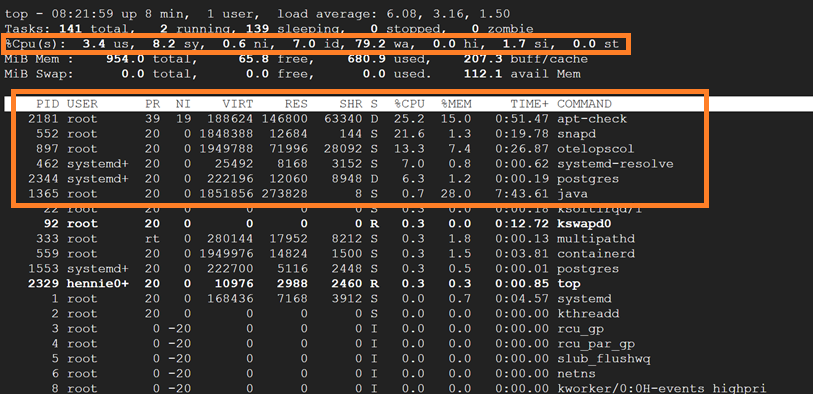 top 로그가 출력 되면 아래와 같이 CPU의 사용율 상태와 실행 중인 프로세스들이 나온다.