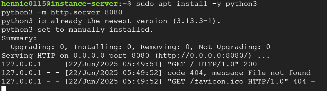 임시로 8080 포트에서 응답하는 간단한 서버를 만들어 확인하면 된다. 아래의 명령어를 입력한 뒤 다시 도메인에 접속해보자. 내 도메인 연결이 아주 잘 되는 것을 확인할 수 있다.