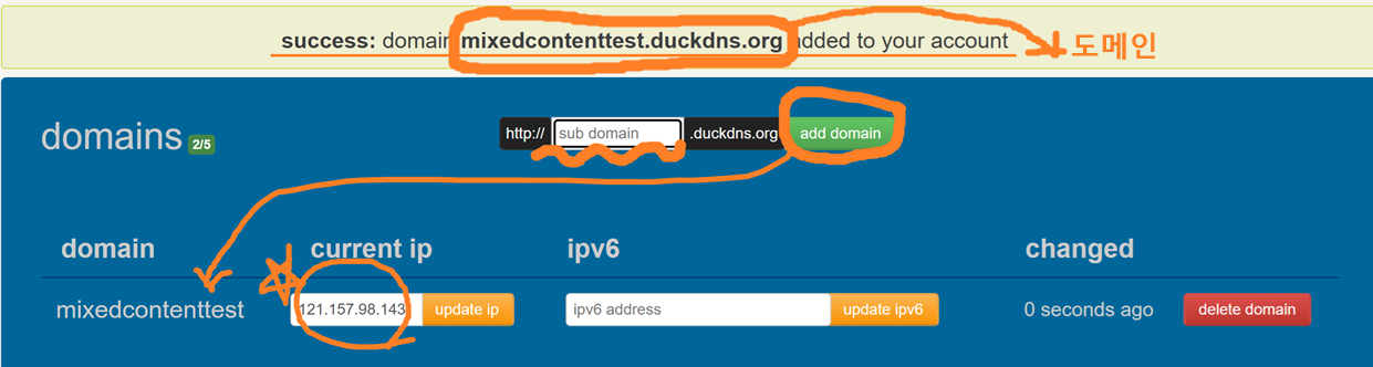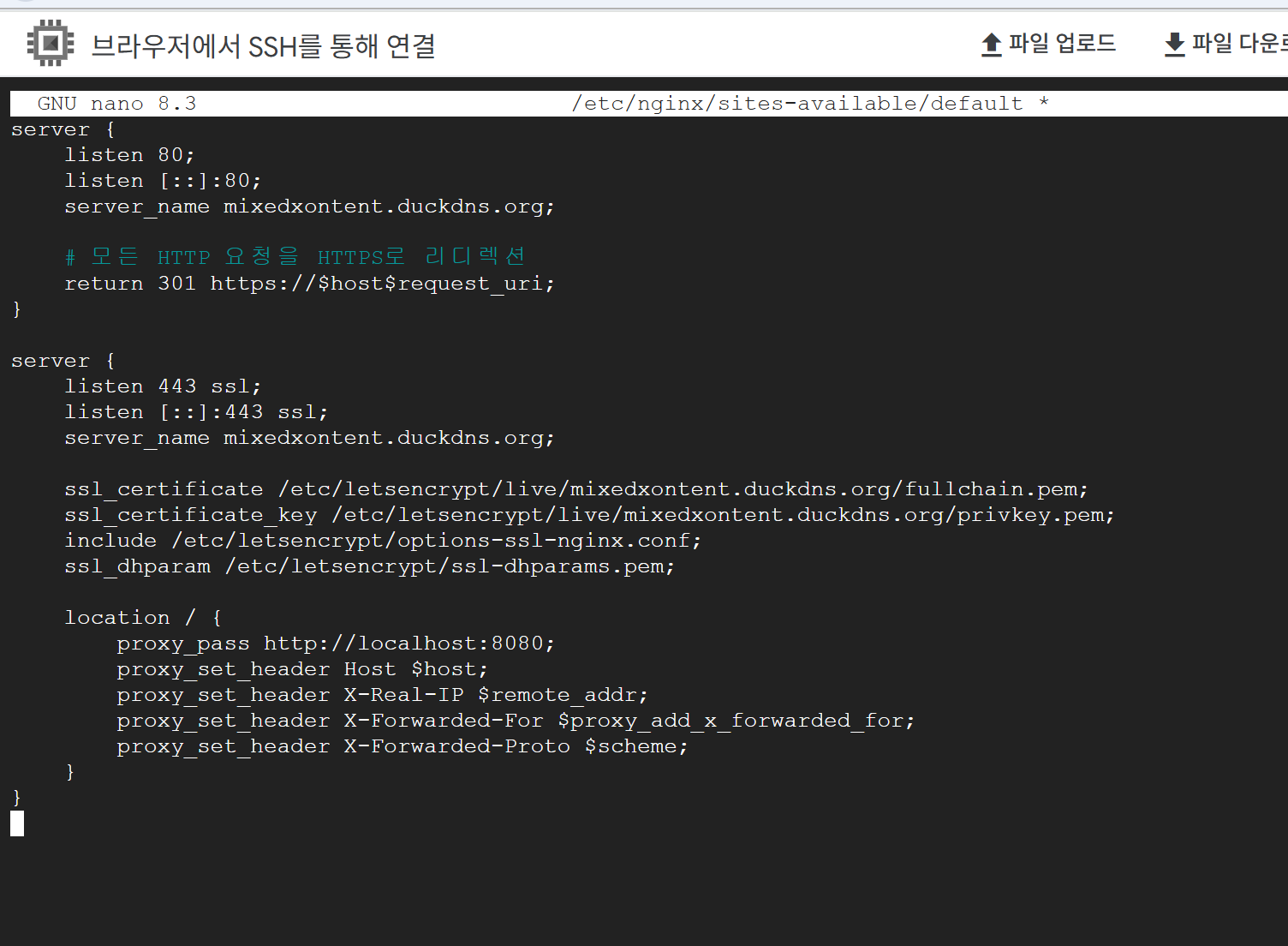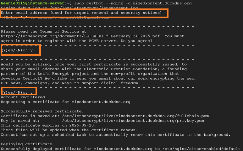 sudo certbot --nginx -d 도메인 (ex : mixedxontent.duckdns.org)