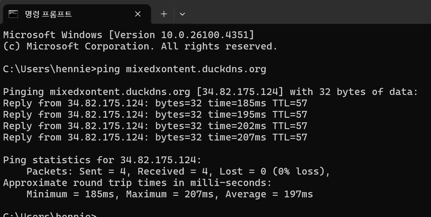 도메인을 만들고 나면 current ip를 입력하는 공간에 GCP VM의 외부 고정 IP 주소를 넣어준다. update ip를 누른 후 cmd 창을 켜 A 레코드가 제대로 연결되었는지 ping 명령어를 ( ping 도메인 )이용해 확인해 준다.